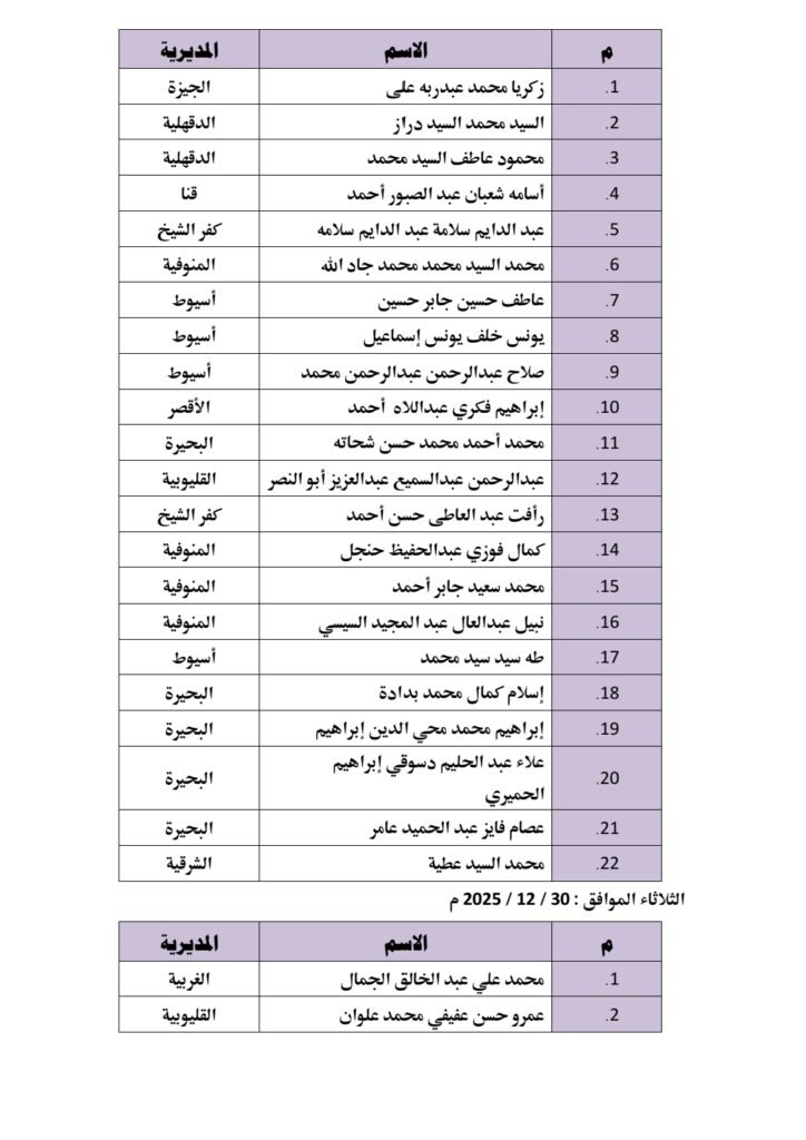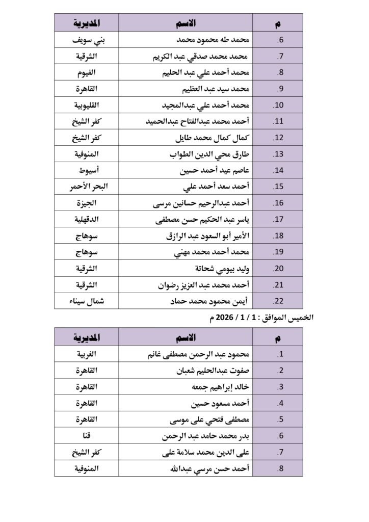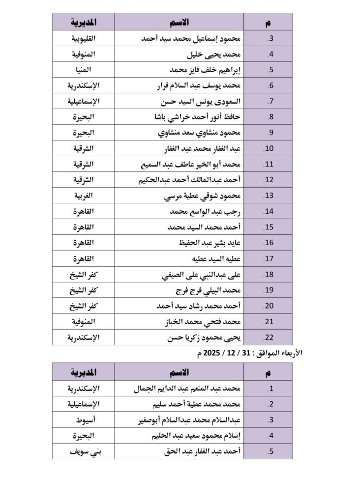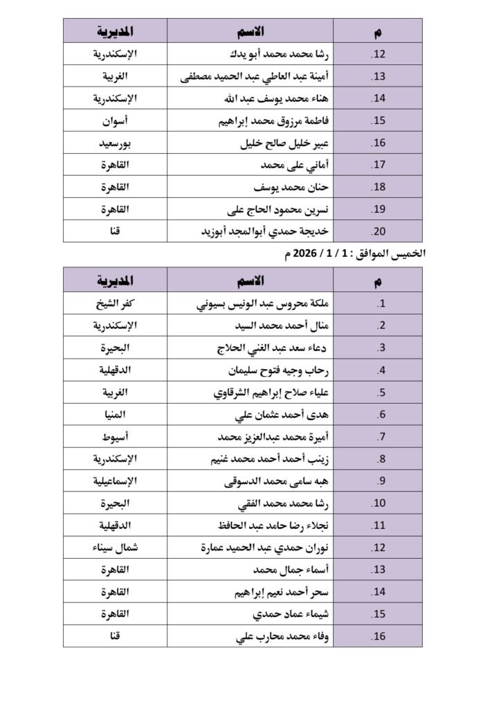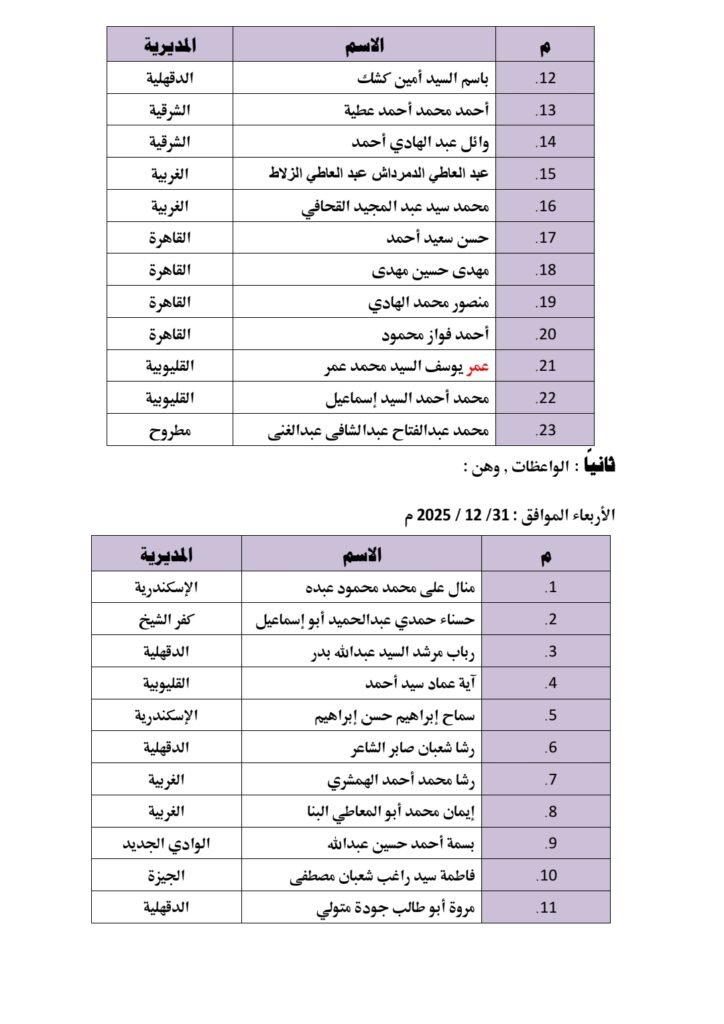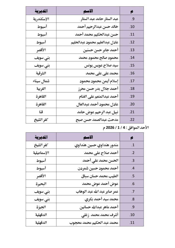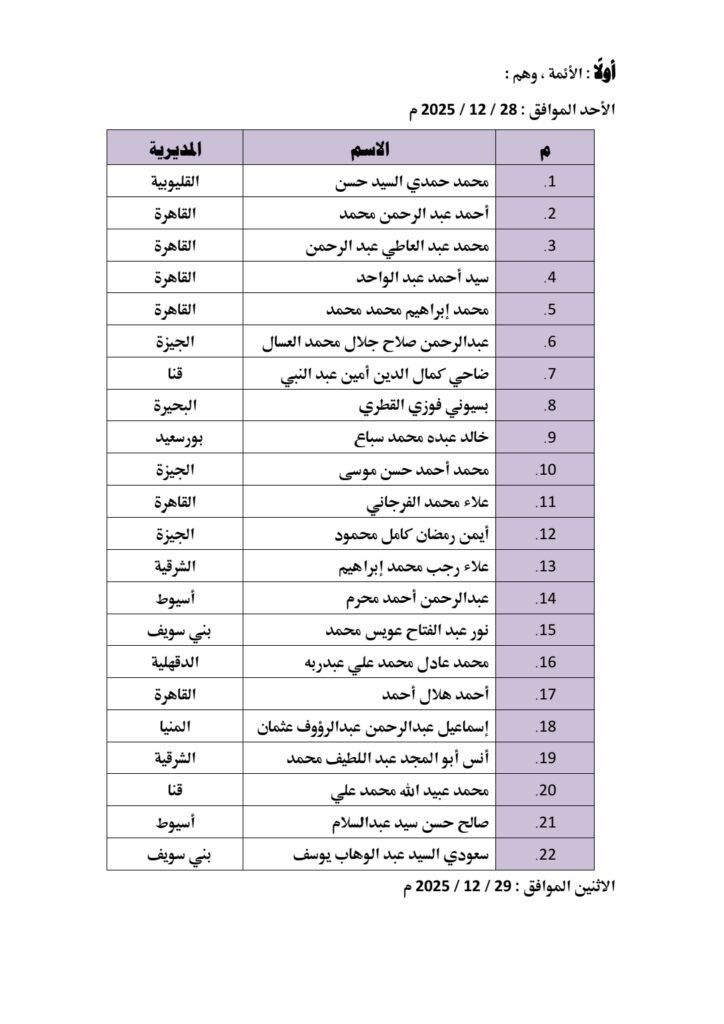 مرافقة بعثة الحج لعام 2026, تُعلن وزارة الأوقاف أسماء المتقدمين ومواعيد الاختبار الشفوي لمسابقة مرافقة بعثة الحج لعام (١٤٤٧هـ – ٢٠٢٦م) من الأئمة والواعظات، على أن يُعقد الاختبار بمسجد النور بالعباسية في تمام الساعة التاسعة والنصف صباحًا، وفقًا للجدول المرفق.