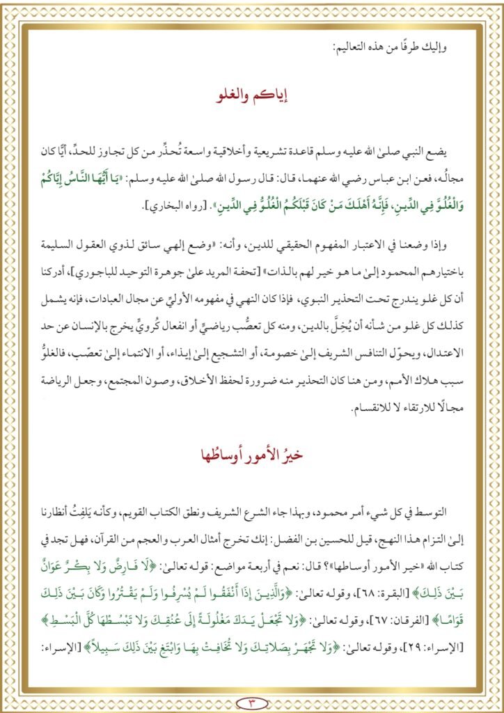 ولم تُغْفِل تعاليم الإسلام بما حملته من أخلاق رفيعة وآداب سامية، التحذيرَ من خطورة الانزلاق خلف مسارات التطرّف بأشكاله المختلفة؛ إذ جاءت نصوصه واضحة في الدعوة إلى الوسطية، وصيانة المجتمع من كل غلوّ يفسد العقول، أو تعصّب يهدّد وحدة الصف، أو اندفاع يجرف الإنسان بعيدًا عن جادّة الاعتدال، فالإسلام في مبادئه المقاصدية وأحكامه التربوية يرسّخ ميزانًا دقيقًا يحفظ للإنسان توازنه، ويجنِّبه مغبَّة الانجرار وراء الغلو الذي يبدِّد الطاقات ويُضعف بناء المجتمع.