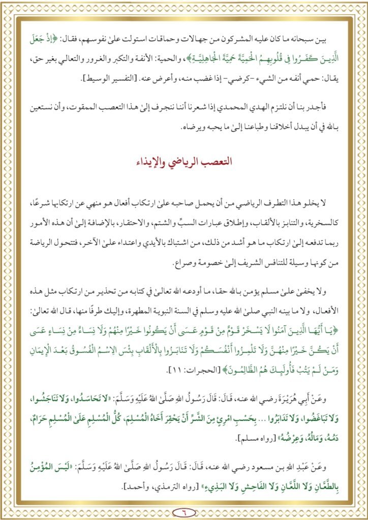 – أن نعلم أن الغرضَ من الرياضة الترويحُ عن النفس، فهي (لهو مباح)، هذا إطارها الذي لا بدّ أن توضع فيه؛ ومِن ثَم فلا يصح: الموالاةُ والمعاداة عليها، أو انتشارُ الأحقاد والضغائن بسببها، أو تعطيلُ المصالح والضروريات من أجلها، أو جريانُ السباب والشتائم وفواحش الألفاظ والتنابز بالألقاب على اللسان في شأنها.