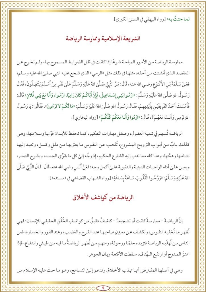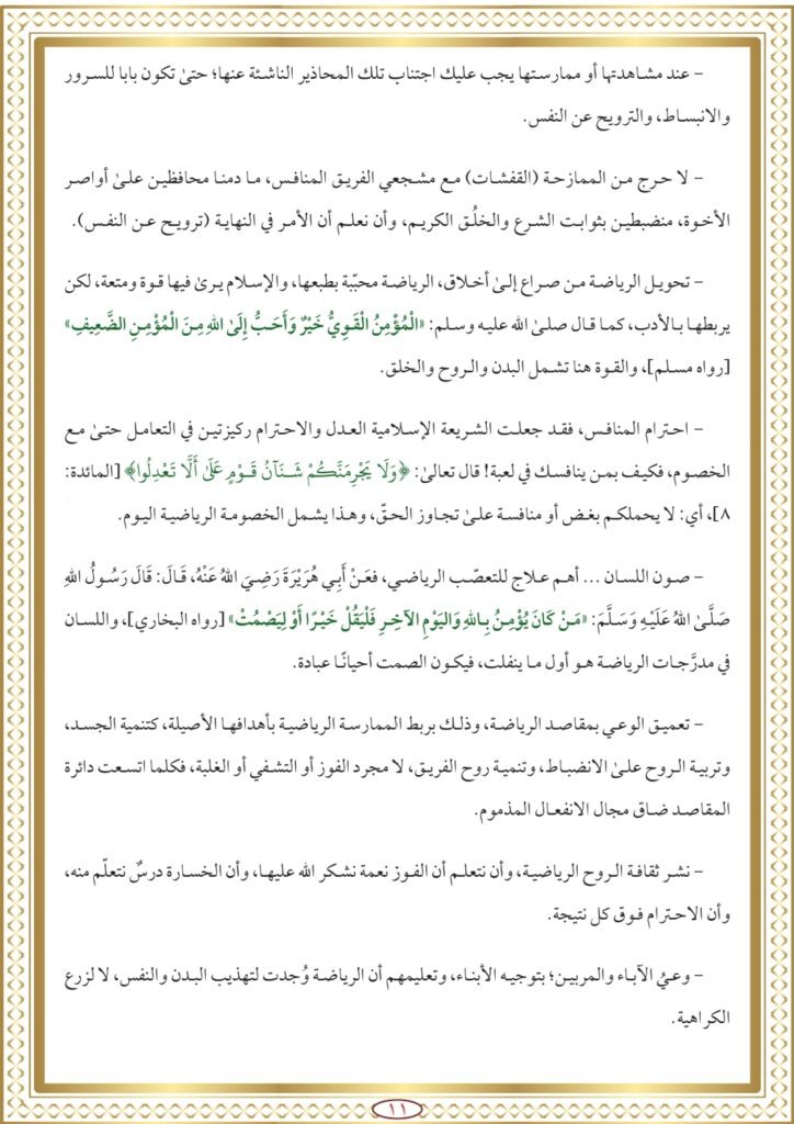 – تحويل الرياضة من صراع إلى أخلاق، الرياضة محبّبة بطبعها، والإسلام يرى فيها قوة ومتعة، لكن يربطها بالأدب، كما قال صلى الله عليه وسلم: «الْمُؤْمِنُ الْقَوِيُّ خَيْرٌ وَأَحَبُّ إِلَى اللهِ مِنَ الْمُؤْمِنِ الضَّعِيفِ» [رواه مسلم]، والقوة هنا تشمل البدن والروح والخلق.