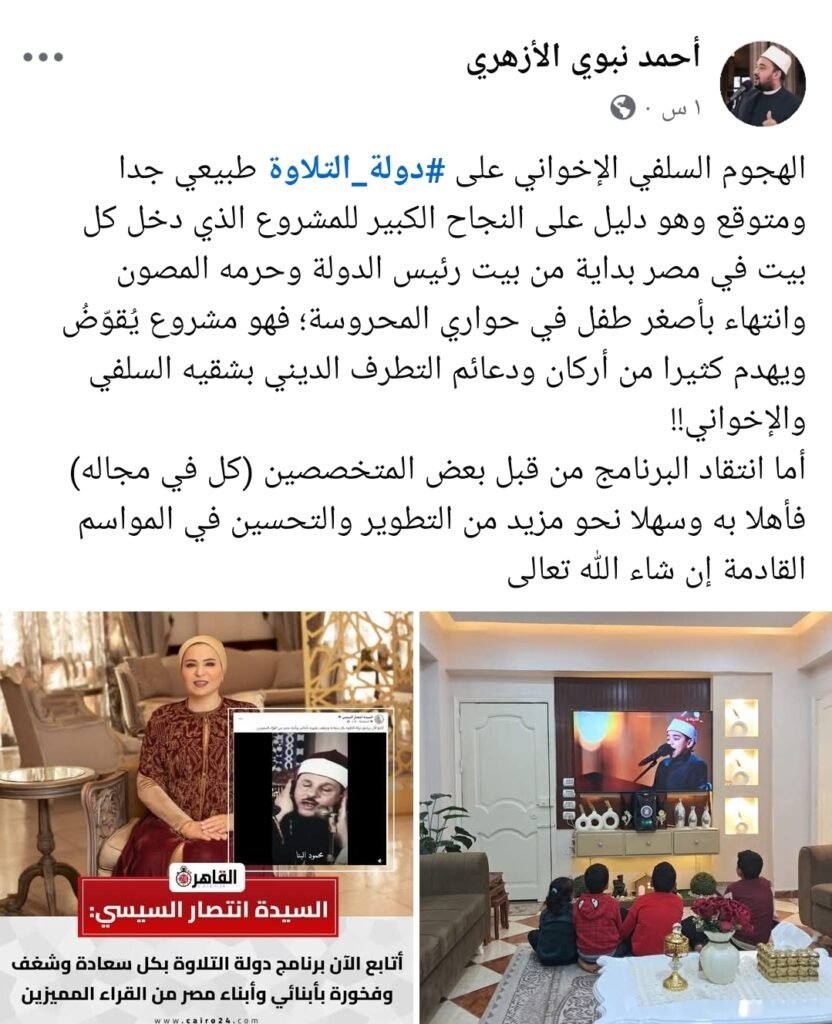 قال الدكتور أحمد نبوي الازهري، عضو المكتب الفني لوزير الأوقاف أن الهجوم السلفي الإخواني على #دولة_التلاوة طبيعي جدا ومتوقع وهو دليل على النجاح الكبير للمشروع الذي دخل كل بيت في مصر بداية من بيت رئيس الدولة وحرمه المصون وانتهاء بأصغر طفل في حواري المحروسة.