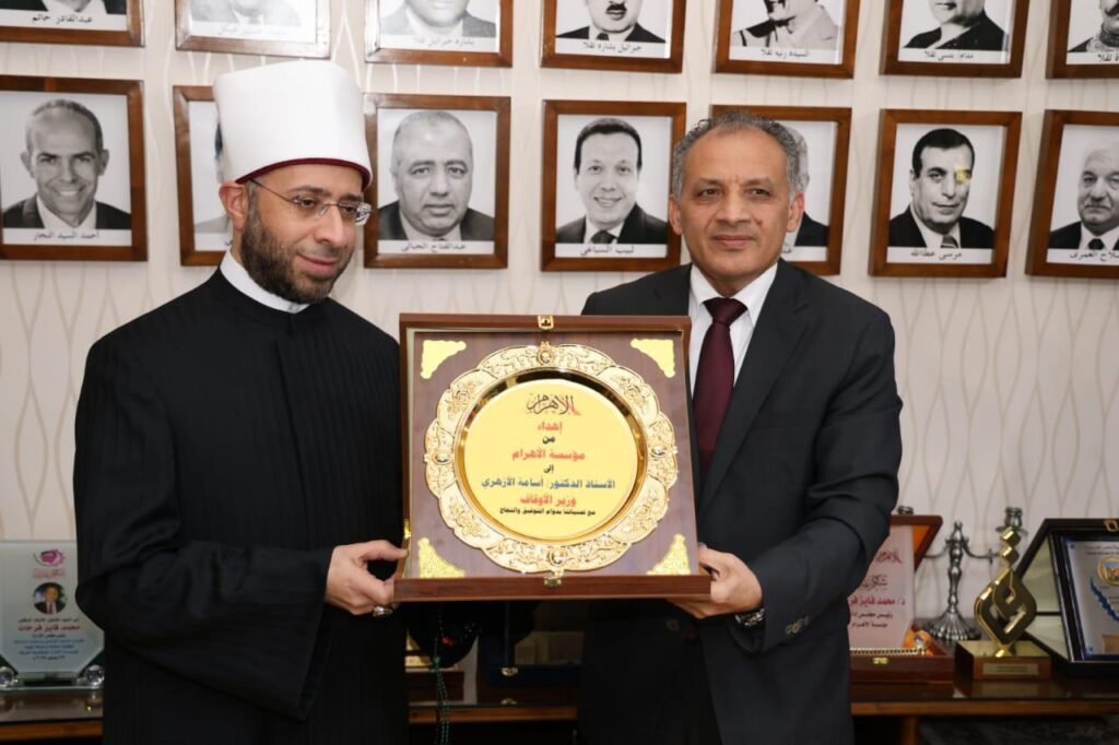 وفي ختام الندوة، أهدى قيادات المؤسسة درع مؤسسة الأهرام لوزير الأوقاف، إلى جانب مصحف شريف، والعدد الأول من الجريدة؛ تقديرًا لجهوده في خدمة القرآن الكريم وتجديد الخطاب الديني.