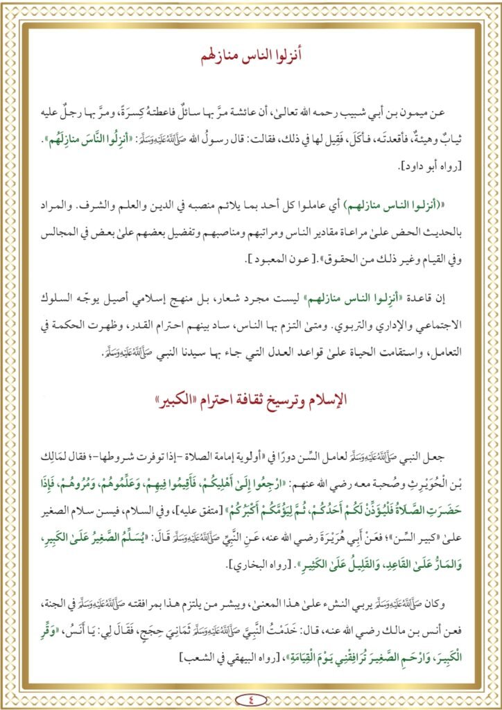 إن قاعدة “أنزِلوا الناس منازلهم” ليست مجرد شعار، بل منهج إسلامي أصيل يوجّه السلوك الاجتماعي والإداري والتربوي. ومتى التزم بها الناس، ساد بينهم احترام القدر، وظهرت الحكمة في التعامل، واستقامت الحياة على قواعد العدل التي جاء بها سيدنا النبي صلى الله عليه وسلم.