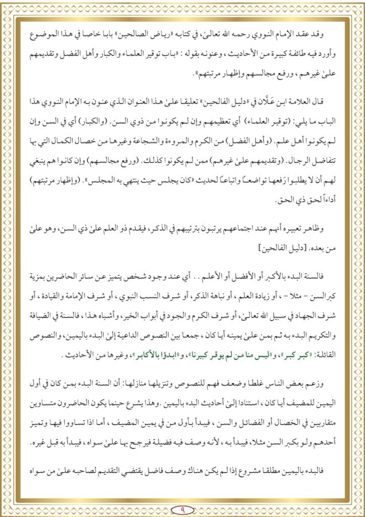 وقد عقد الإمام النووي رحمه الله تعالى، في كتابه “رياض الصالحين” بابا خاصا في هذا الموضوع وأورد فيه طائفة كبيرة من الأحاديث، وعنونه بقوله : “باب توقير العلماء والكبار وأهل الفضل وتقديمهم على غيرهم، ورفع مجالسهم وإظهار مرتبتهم”.