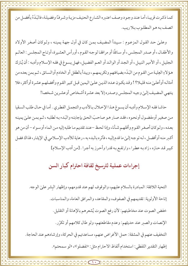 ٥- أدب تقديم الضيافة والبَدْء فيها بالأكبر أوالأعلم ثم من على يمينه: