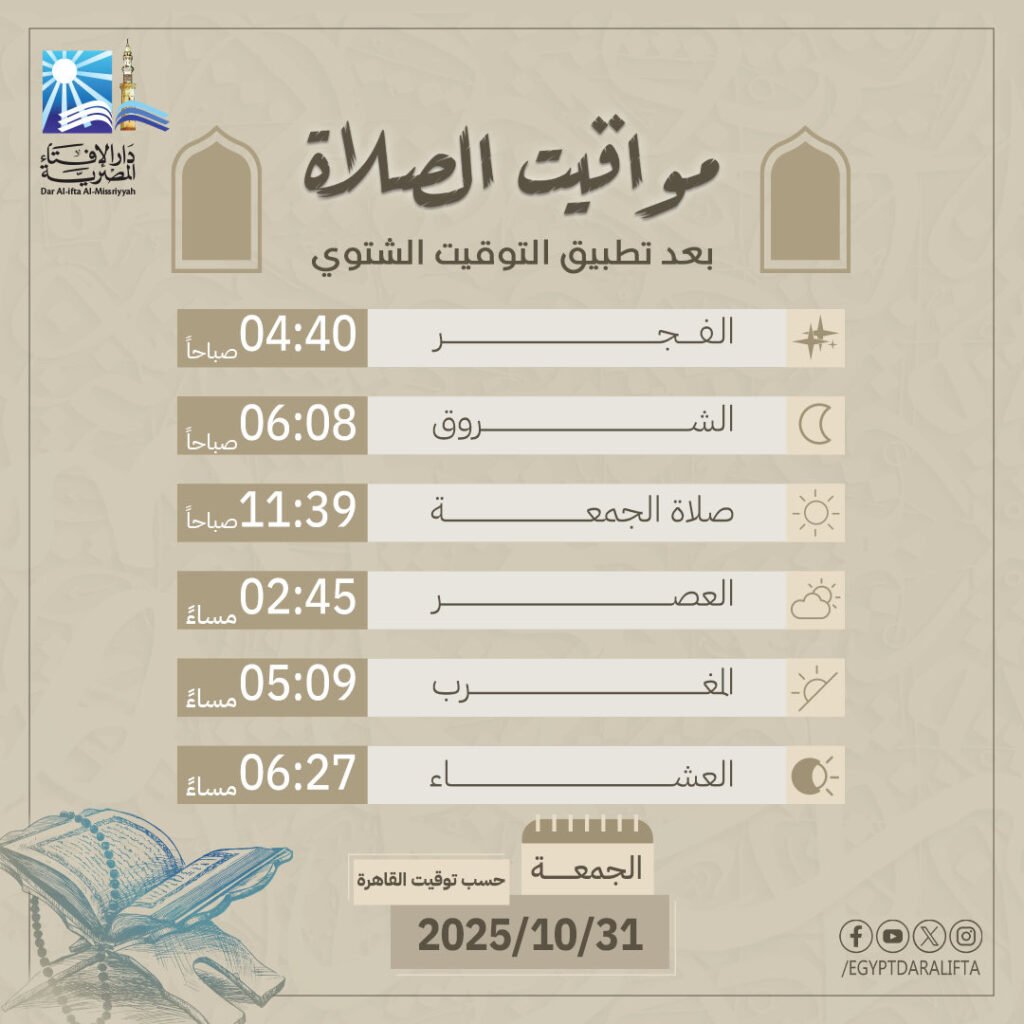 خلاصة القول، بدءاً من فجر الجمعة 31 أكتوبر 2025، ستكون جميع مواقيت الصلاة في القاهرة والمحافظات مبكرة بمقدار ساعة كاملة عن مواقيتها الحالية. وتدعو دار الإفتاء المصرية والمؤسسات الدينية المواطنين إلى متابعة جداول المواقيت الجديدة الصادرة عن الهيئة المصرية العامة للمساحة، أو الاعتماد على التطبيقات الموثوقة، والاستعداد لهذا التغيير لضمان الحفاظ على أداء الصلوات في أوقاتها المحددة شرعاً.