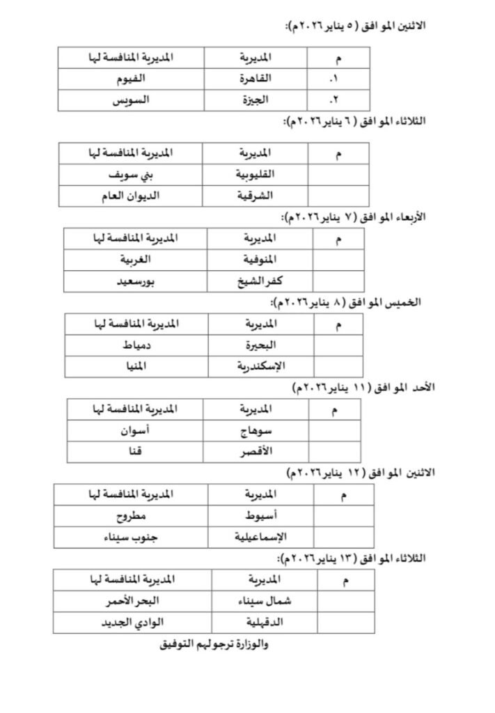 ومن المقرر أن تقام التصفيات بين المديريات على النحو التالي: