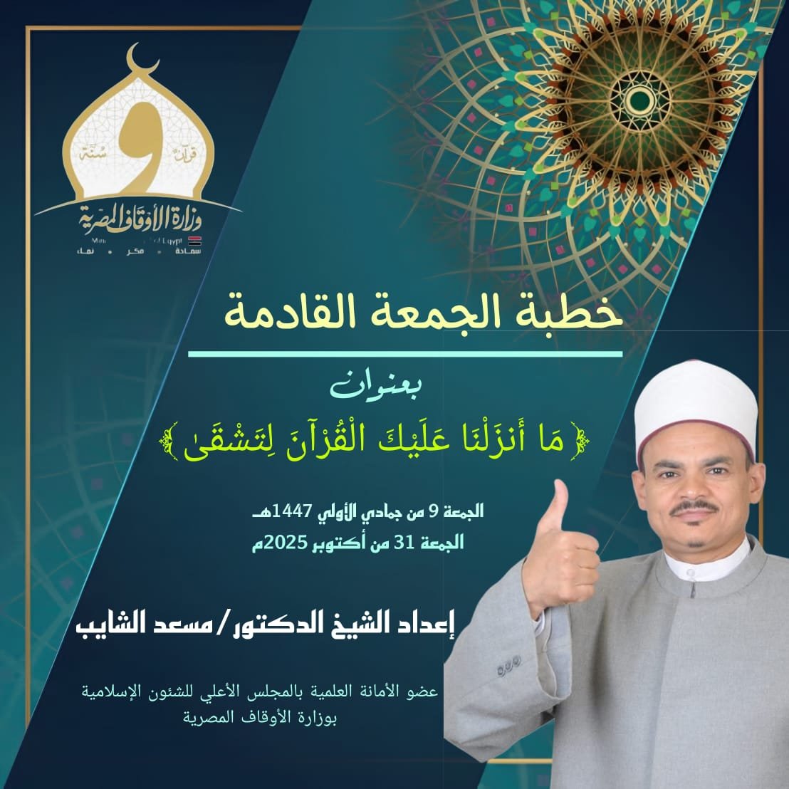 نص خطبة الجمعة مكتوبة للدكتور مسعد الشايب بعنوان “ما أنزلنا عليك القرآن لتشقى”