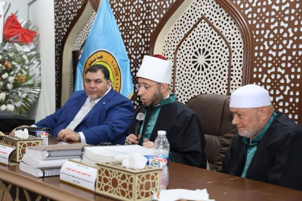 وضمَّت لجنة المناقشة والحكم على الرسالة كلًّا من: الأستاذ الدكتور أسامة الأزهري – وزير الأوقاف، أستاذ الحديث وعلومه المساعد بكلية أصول الدين بالقاهرة – مشرفًا أصليًّا؛ والأستاذ الدكتور عاطف محمد أبو العباس – مدرس الحديث وعلومه بكلية أصول الدين والدعوة بالزقازيق – مشرفًا مشاركًا؛ والأستاذ الدكتور عبد الحميد محمد أحمد العياط – أستاذ الحديث وعلومه المتفرغ بكلية أصول الدين والدعوة بالزقازيق – مناقشًا داخليًّا، والأستاذ الدكتور أحمد محمد علي بيومي – أستاذ الحديث وعلومه، العميد السابق لكلية الدراسات الإسلامية والعربية للبنات بالقرين، عضو اللجنة العلمية الدائمة لترقية الأساتذة والأساتذة المساعدين – مناقشًا خارجيًّا. وقد استُهلَّت المناقشة بتلاوة قرآنية عطرة للقارئ الشيخ عبد الفتاح الطاروطي.